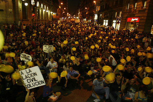 The first analysis of the weight of abstention in these forthcoming elections has been offered today by the centre press "La Vanguardia" who suggest the thrust of "not voting" favours nationalist party result. The same newspaper devoted an editorial entitled No Violents! following up on its declaration of a "riot!" last week (C/F http://indymedia.ie/article/78839?&condense_comments=fa...70518 ) congratulating the Catalan police force on their supervision of 400 youngsters of "squater appearance" on October 12th. Because of course there was 1.3 mossos d'esquadra walking side by side with the terrifying anti-system youngsters. Who "La Vanguardia" tells us count on a global travel network to support their shilelee-wielding-shaninigans. I repeat on my filagree web bounce opinion space -