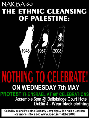 THE ETHNIC CLEANSING OF PALESTINE: NOTHING TO CELEBRATE! ON WEDNESDAY 7th MAY PROTEST THE 'ISRAEL AT 60' CELEBRATIONS Assemble 6pm @ Ballsbridge Court Hotel, Dublin 4 - Wear black clothing