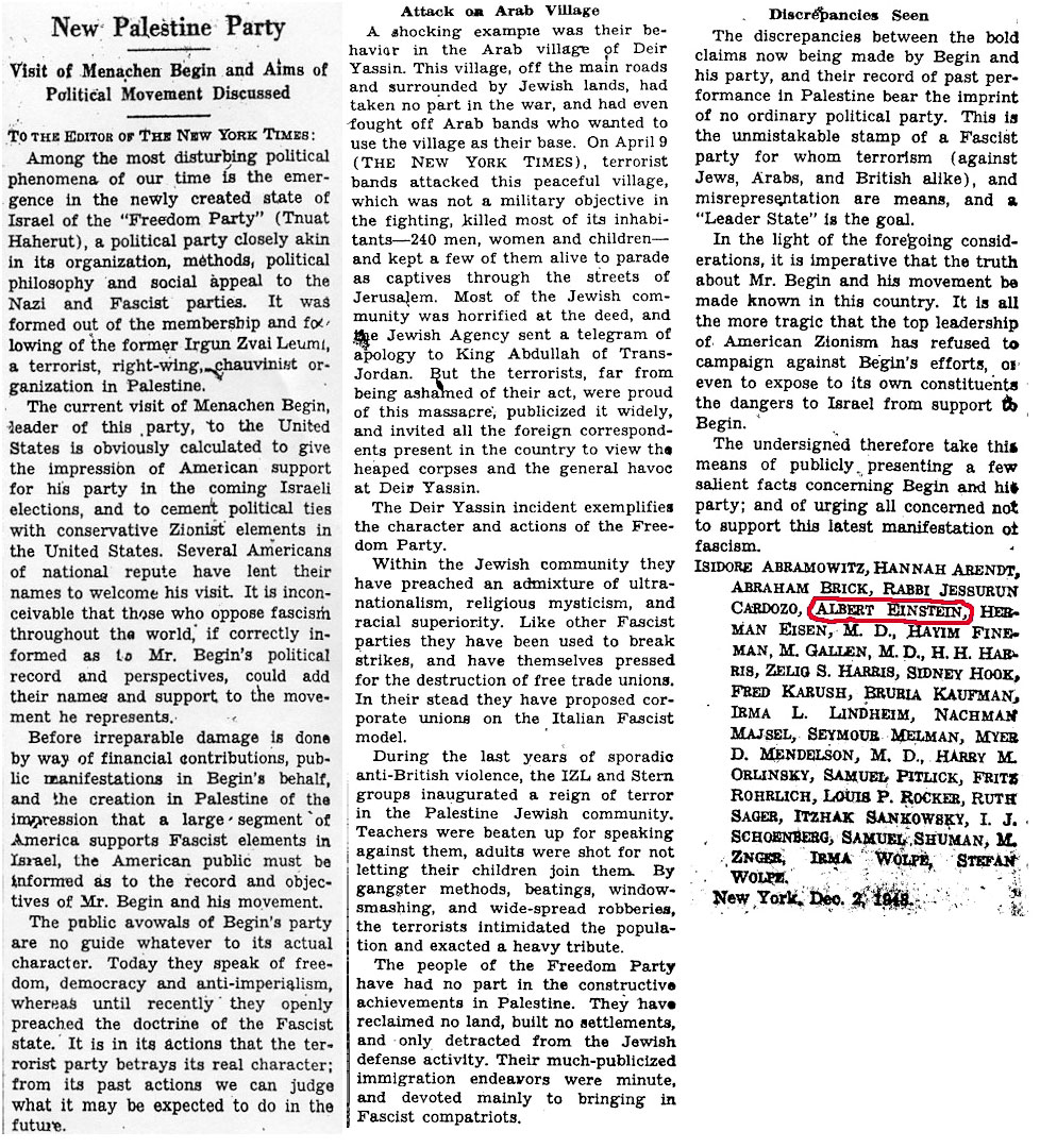 Letter From ALBERT EINSTEIN 1948, comparing Political Zionism to Nazism
