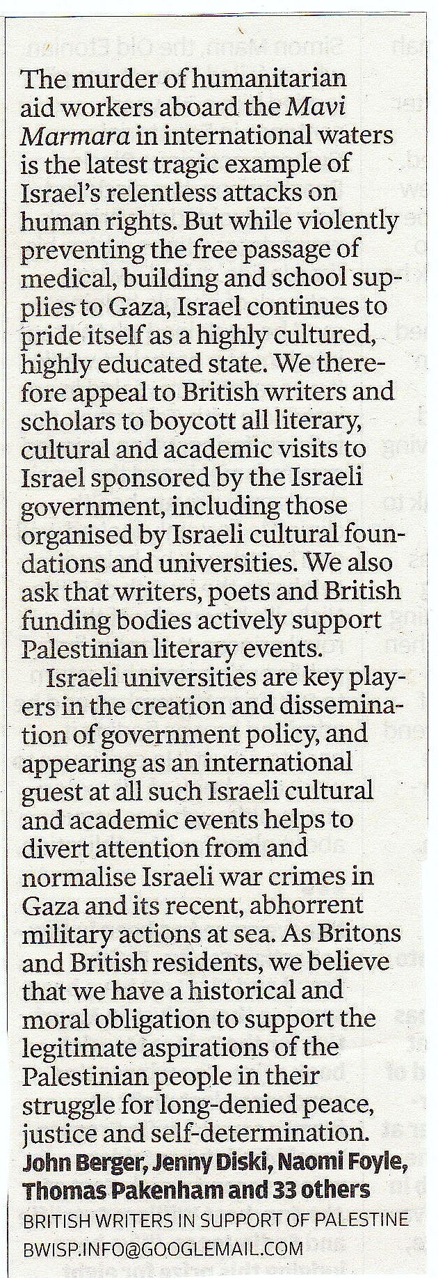 I would appeal to individual writers and academics to compose their own letters calling for a cultural and academic boycott and send them to newspapers, radio stations, talk shows, TDs (if you can find one!) and Senators. Sending round a circular letter takes, with amendments, time and loses the necessary momentum. Our own government has permitted us to be slapped in the face over the issue of Mossad's use of Irish passports and the arrogant response of the Israeli ambassador to a request to appear before the Oireachtas. Australia is the latest country to exercise certain relevant economic disengagements. We, sadly, can expect nothing from our own craven government.